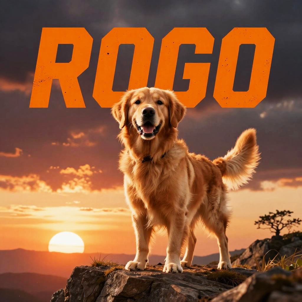 Photograph of a golden retriever standing on a rocky cliff at sunset, with "ROGO" in bold orange letters above, against a dramatic,