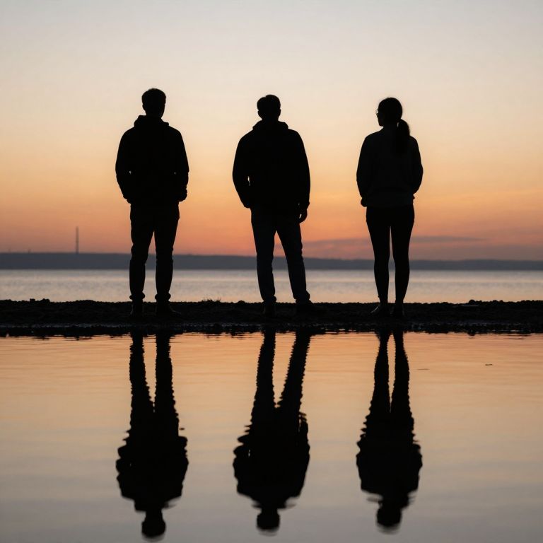 Silhouetted figures stand side by side on a tranquil water's edge, their reflections mirrored perfectly as they gaze toward a serene sunset horizon, evoking a sense of introspection and shared contemplation.