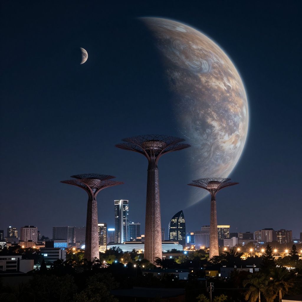 Photograph of a futuristic cityscape at night featuring three large, illuminated, tree-like structures with crown-like tops in the foreground. In the background, a large, partially visible planet with a crescent moon in the top left corner dominates the dark blue sky. The city's skyscrapers are brightly lit with various colors, including white, blue, and yellow. The planet's surface shows detailed, textured patterns. The scene blends urban and sci-fi elements, with the planet's size and detail suggesting a high level of realism in the photograph.