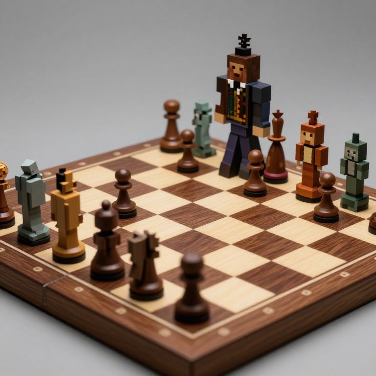 Photograph of a wooden chessboard featuring pixelated, Minecraft-style chess pieces. The board has a light beige and dark brown checkered pattern. Pieces include a black pixelated knight in the center-right, surrounded by brown, green, grey, and yellow pieces. The background is a gradient from light grey to white, emphasizing the chessboard and pieces. The image has a shallow depth of field, focusing sharply on the chessboard and pieces while the background is slightly blurred. The style combines realistic photography with pixelated, blocky design elements.