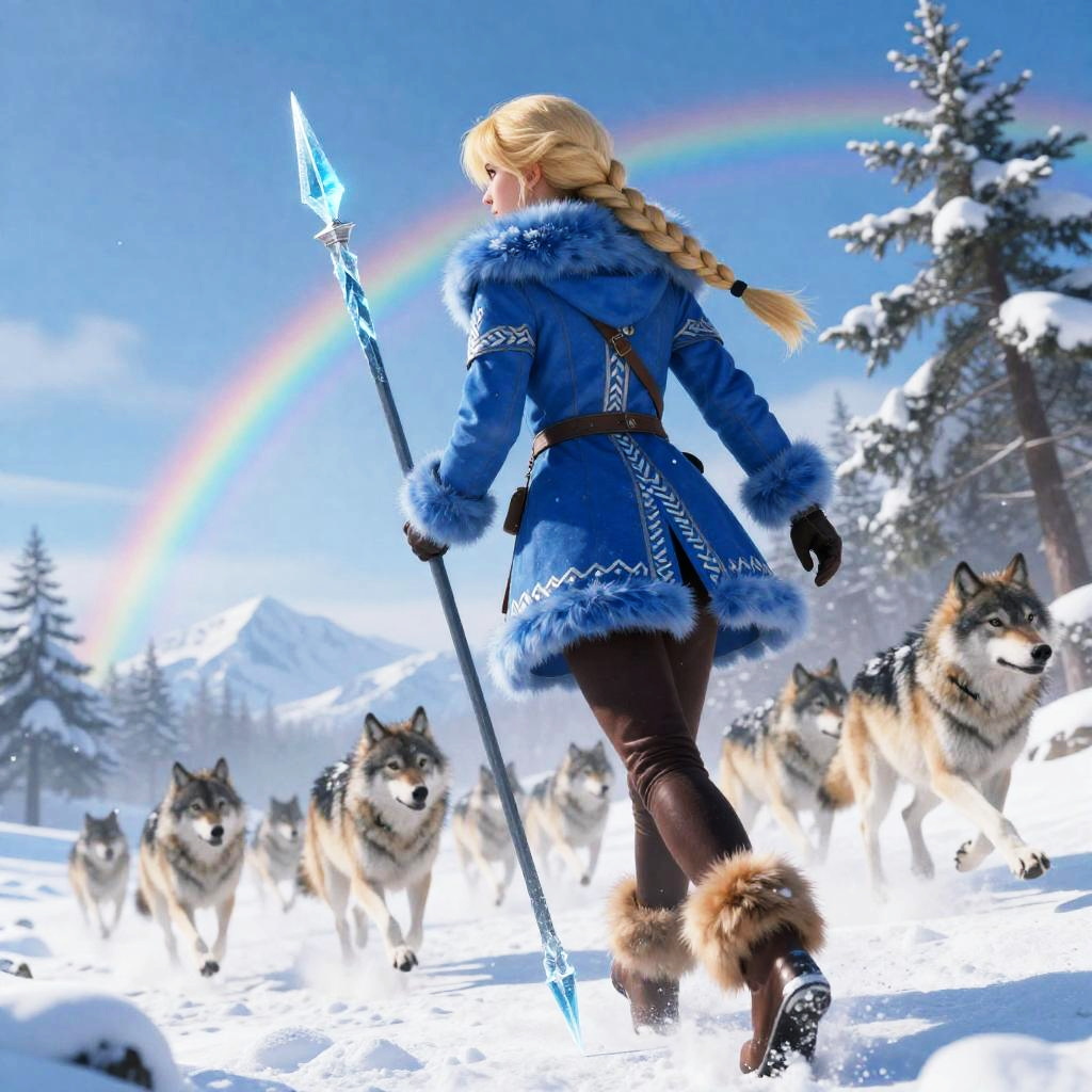 Solo focus, (masterpiece), best quality, ultra-detailed, illustration, fantasy, (wide_shot:1.2), (from below, dutch_angle), (letterboxed), dutch angle, (((1girl, (ahoge, long, french braid blonde hair) (blue fur-trimmed coat, white Nordic runes) (brown leather pants) (fur boots) (holding ice spear)))), walking, (a group of wolves running in background:1.3), blue sky, icy, rainbow, snowing, tress, winter, mountainous horizon background, light_particles, caustics, cinematic lighting, HDR, (volumetric lighting), (blurry foreground:1.3), (sharp focus:1.1), (particleA:0.8)