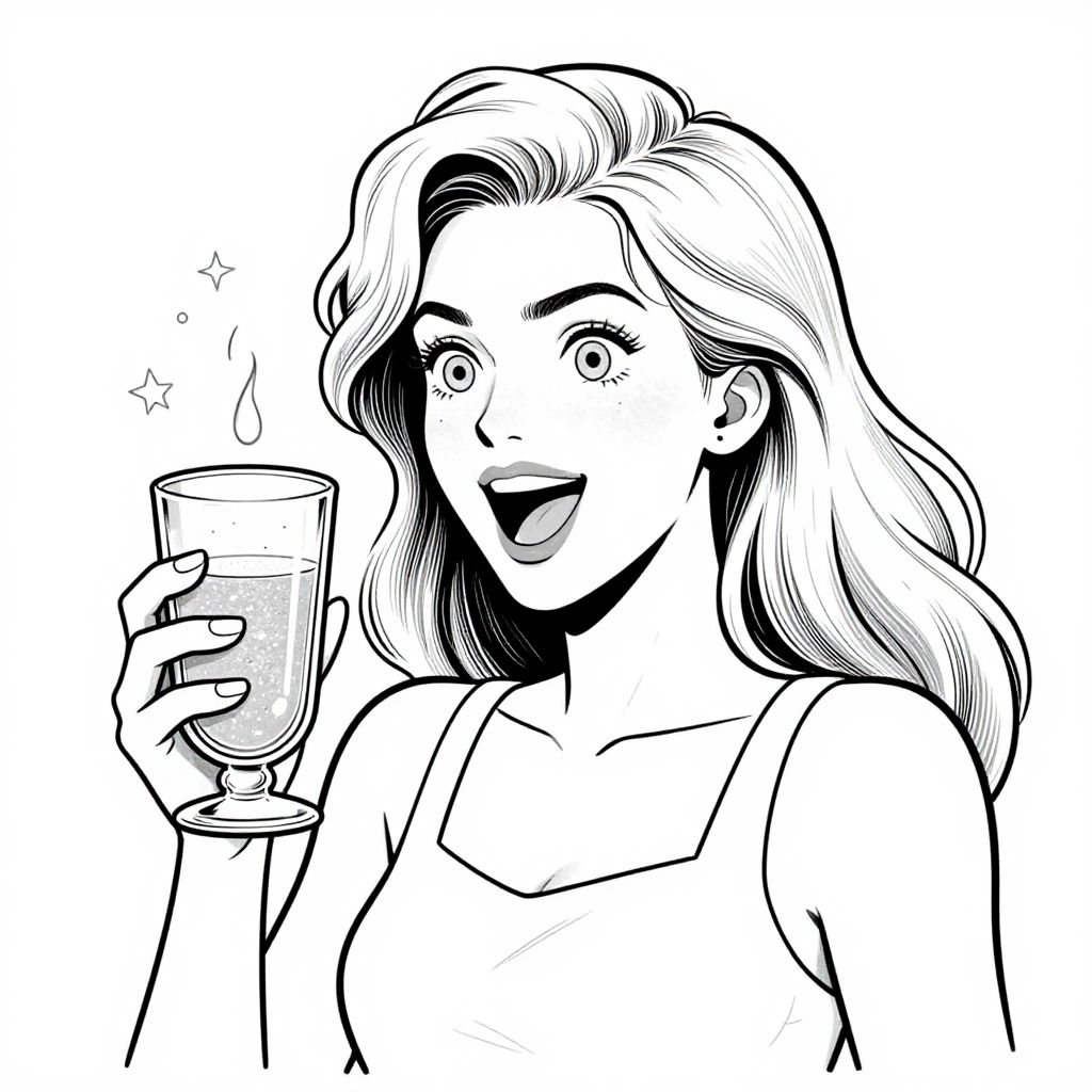 Black-and-white digital drawing of a smiling woman with wavy hair, holding a glass of sparkling liquid in her right hand. She has wide, expressive eyes and an open mouth, conveying joy. She wears a sleeveless top with a square neckline. The background is plain white, emphasizing the character. The drawing style is reminiscent of comic book art, with clean, bold lines and minimal shading. Small sparkles are illustrated around the glass, adding a sense of celebration or excitement. Her left hand is not visible, and the focus is on her upper body.