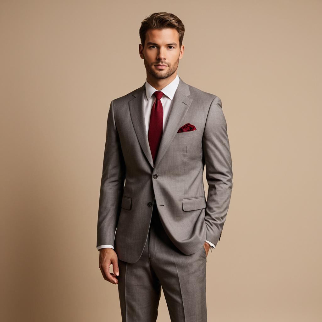 Man outfit, photograph of handsome white man, standing, full body, wearing tan suit, gray vest, white shirt, blue striped tie, pocket square, short brown hair, serious expression, gray background, hands in pockets, studio lighting, business attire, formal, medium shot, portrait, clean style