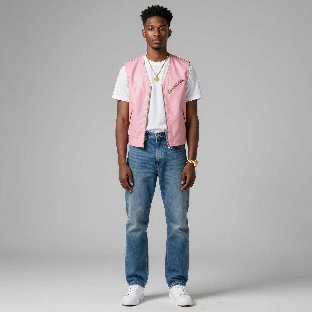Full body portrait of a young black man standing against a plain gray background. He is wearing a pink leather vest over a white t-shirt, paired with blue high-waisted jeans and white sneakers. The man has short black hair styled with a quiff and accessorizes with a gold necklace featuring a round pendant and a gold watch on his left wrist. The image showcases casual modern urban fashion with minimalist studio lighting.