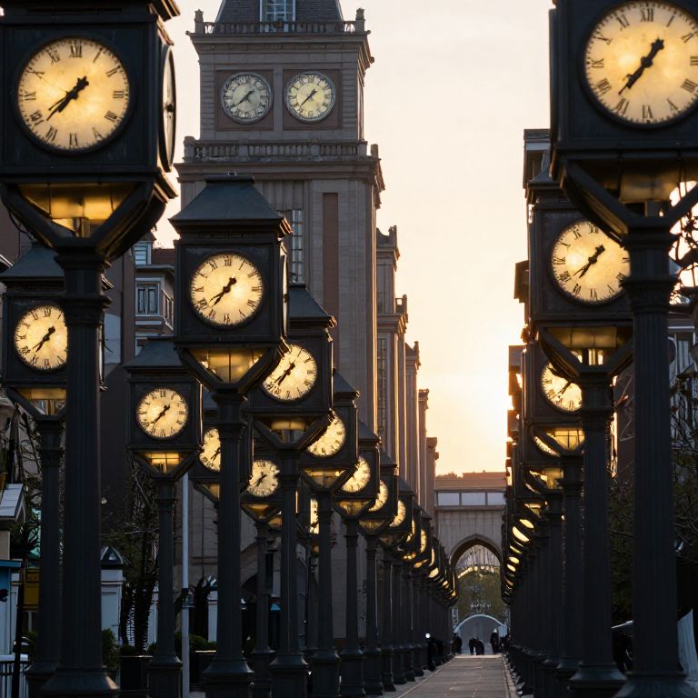 Rows of identical clock towers stretch infinitely into the distance, each adorned with multiple illuminated clocks displaying varying times, creating an illusion of endless temporal pathways converging towards a mysterious, sunlit archway in the background.