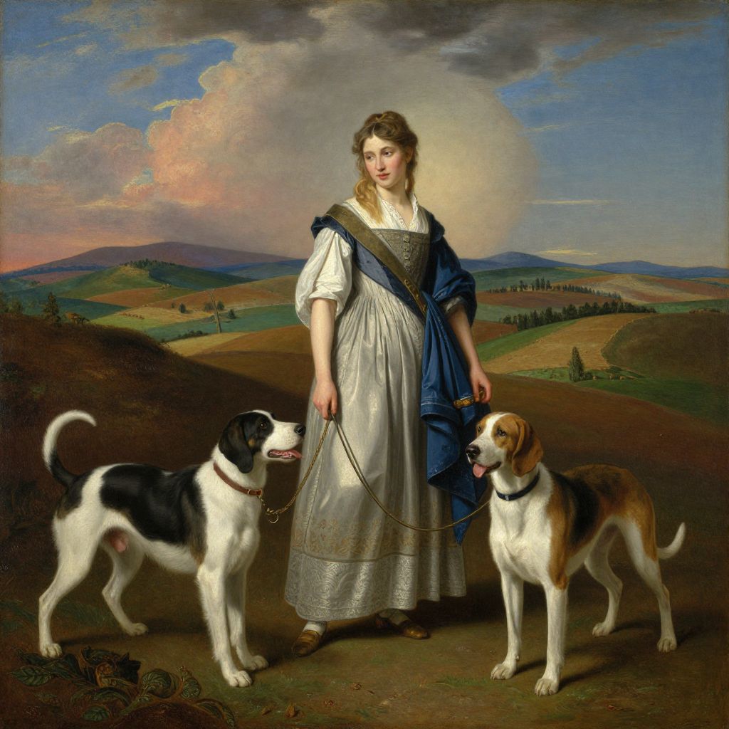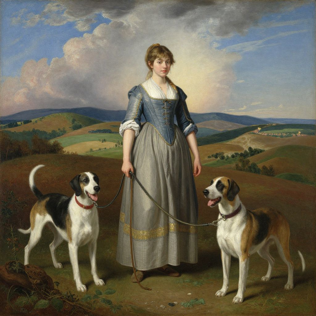 A realistic oil painting depicts a young Caucasian woman with light brown hair, dressed in a blue corset and gray pinafore over a white blouse, standing outdoors. She holds a leash in her right hand, connected to two large, black-and-white beagle dogs standing on either side of her. The dogs have their tongues out, appearing happy. The background features rolling hills, a cloudy sky, and distant fields. The woman's expression is serene, and she stands on a dirt path. The painting's style is reminiscent of 19th-century realism, with detailed textures and vibrant colors.