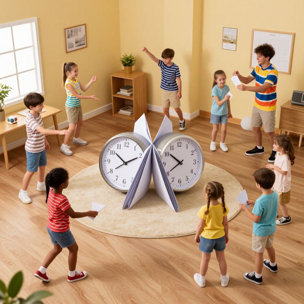 Photograph of a brightly lit, yellow-walled children's room with wooden floors. Six children, diverse in skin tone and dressed in casual summer clothes, stand around a unique clock centerpiece with two large, overlapping clock faces on a round rug. The clock's hands are pointing in different directions. Children have various expressions and gestures, suggesting a playful or educational activity. The room includes a wooden table with a plant and a window letting in natural light. Framed pictures and a small shelf are on the walls. The image has a slightly exaggerated, CGI-like style.