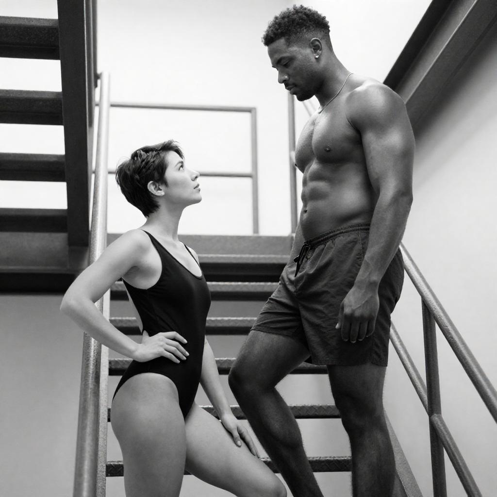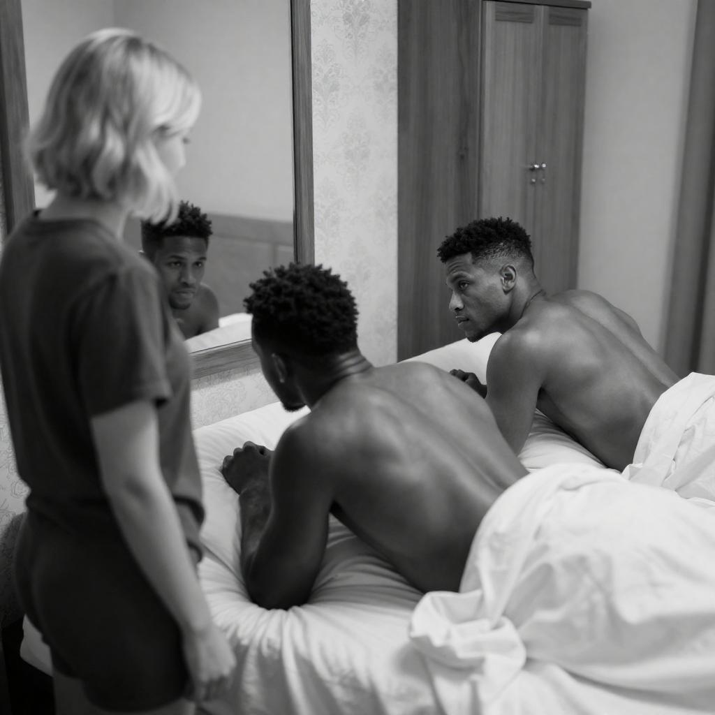 Black-and-white photograph of a bedroom scene. A young blonde woman with short hair stands in front of a mirror, wearing a dark shirt, observing two shirtless Black men with muscular builds and short curly hair, lying in bed with white sheets. The background features patterned wallpaper and a wooden cabinet. The men face each other, while the woman looks at them.