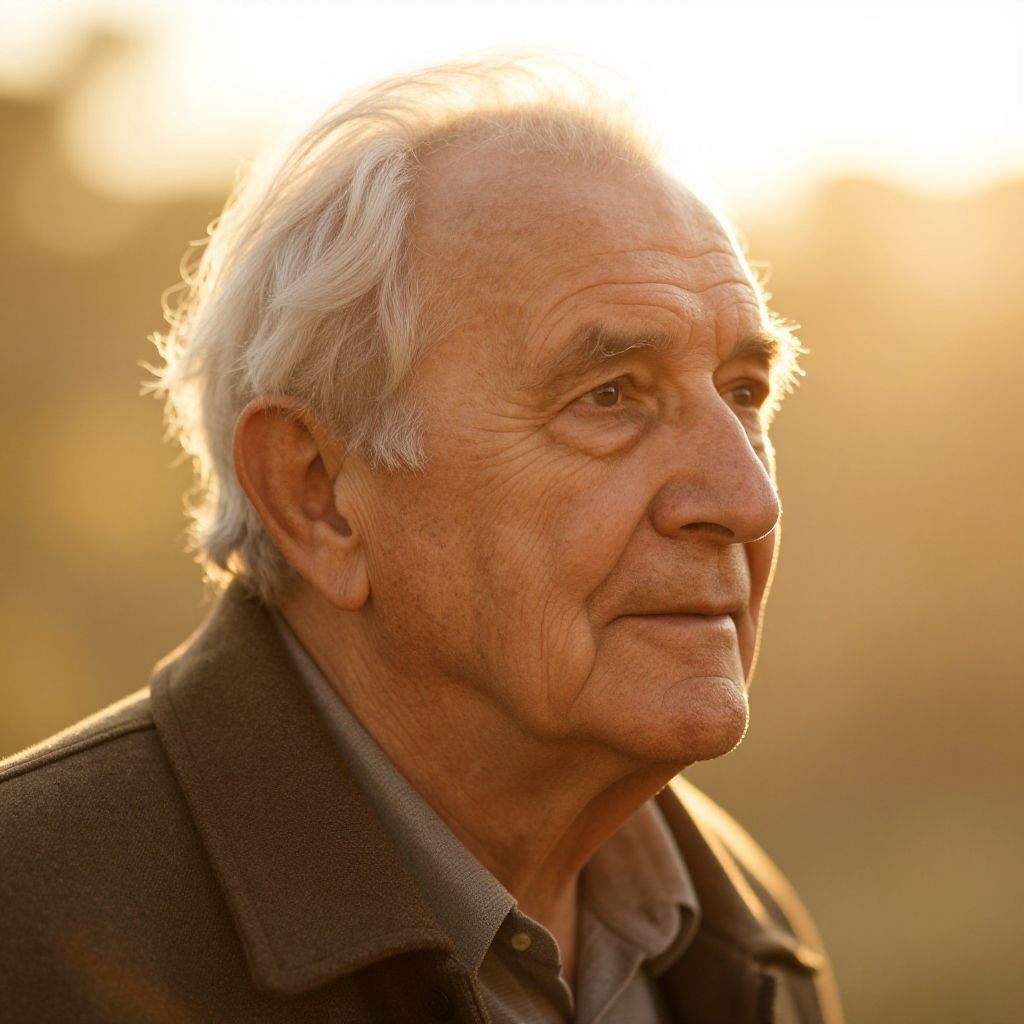A serene portrait of an elderly man, illuminated by warm golden sunlight, captures a moment of reflection and wisdom. His gentle expression and the soft, glowing background create a sense of peace and nostalgia, embodying the beauty of aging and life's experiences.