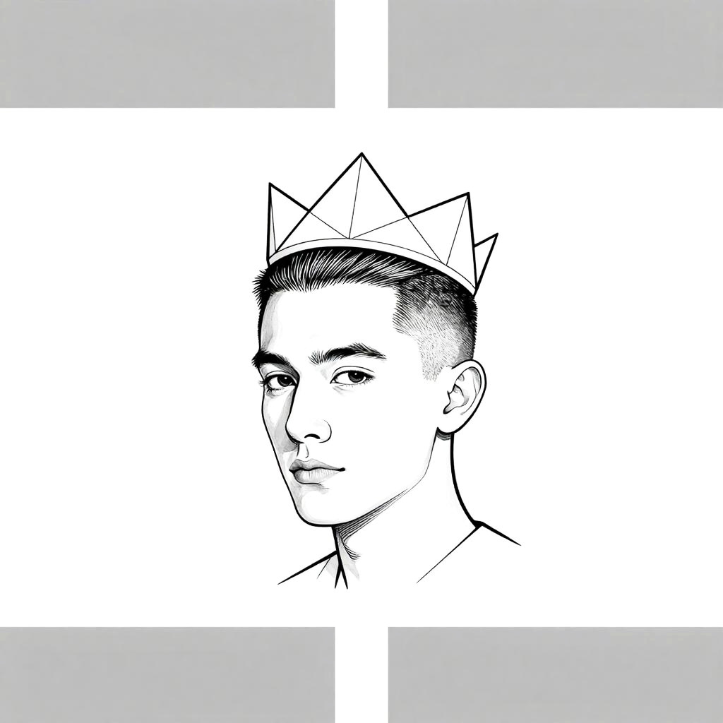 Minimalist black-and-white line portrait of man with shaved head and gentle smile, facing forward, adorned with delicate circle of tiny stars. A tall vertical white stripe divides the center while soft gray bands cap the top and bottom. Ultra-thin monoline, clean contours, high contrast, ample negative space, Swiss Style + subtle sumi brush marks, elegant, no shading, centered composition, white background, quiet contemplative atmosphere.