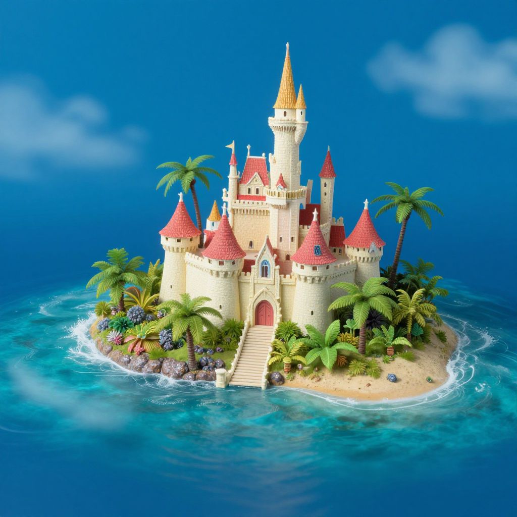 Detailed miniature scale model of a tropical island featuring a whimsical castle with red and gold turrets, surrounded by lush palm trees, colorful plants, sandy beach, and turquoise Caribbean-style waters with visible reef.