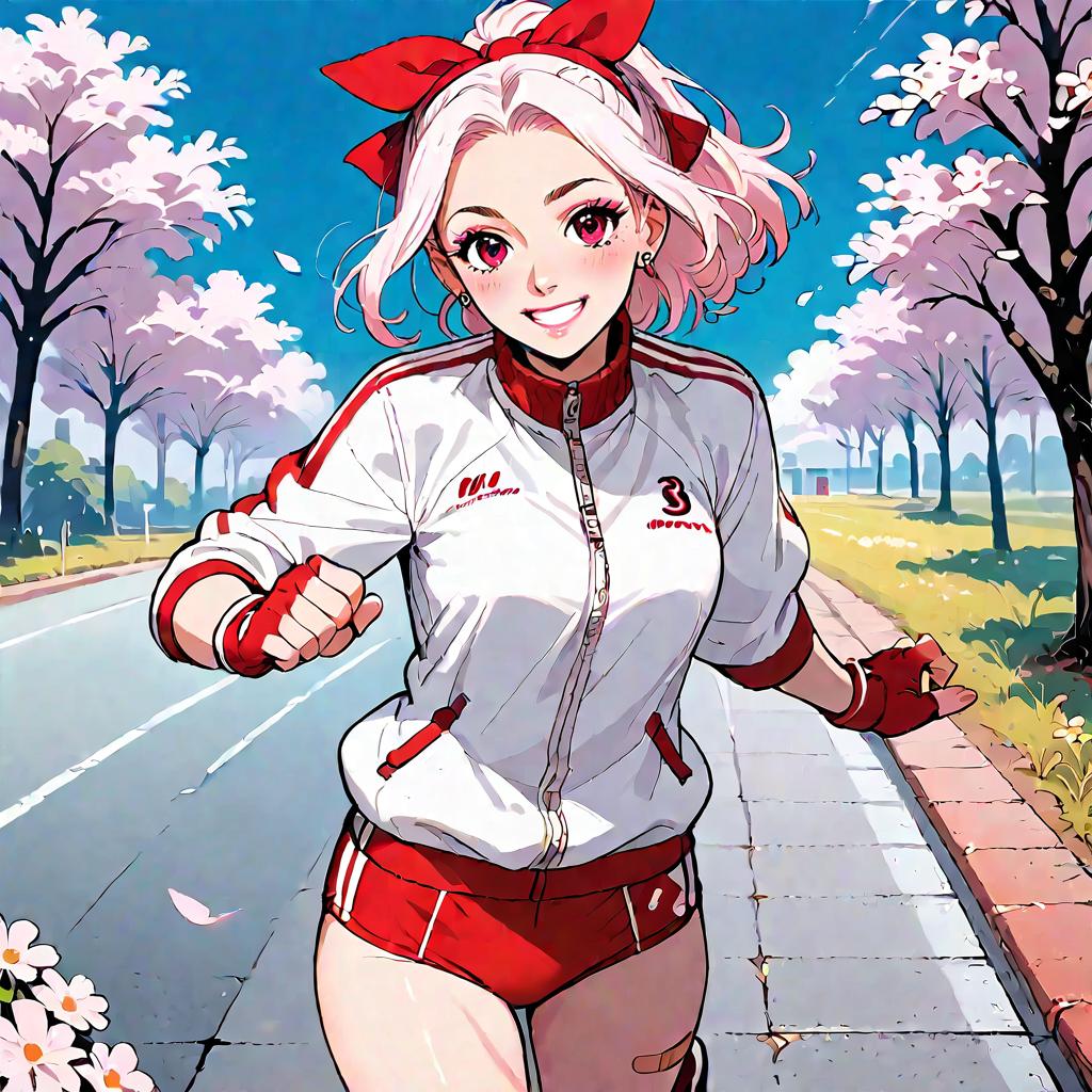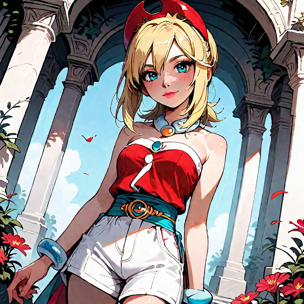 Vibrant anime-style illustration of a smiling young woman standing outdoors in a sunny urban setting. She wears a stylish blue short jumpsuit with a yellow belt, fingerless gloves, elbow pads, and a black and blue sports bra. The character has short blonde hair with bangs and is posed with hands on her hips, looking confidently at the viewer. The background includes buildings, plants in pots, and decorative orange lanterns, suggesting a lively street scene.