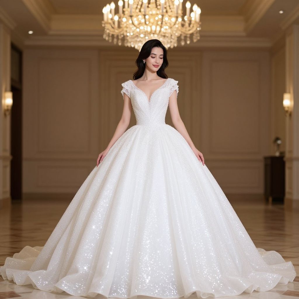 This stunning image features a woman elegantly dressed in a voluminous, sparkling white gown that shines under the soft glow of a grand chandelier. The luxurious ballroom setting emphasizes her radiant beauty and sophisticated style, capturing a moment of grace and glamour.