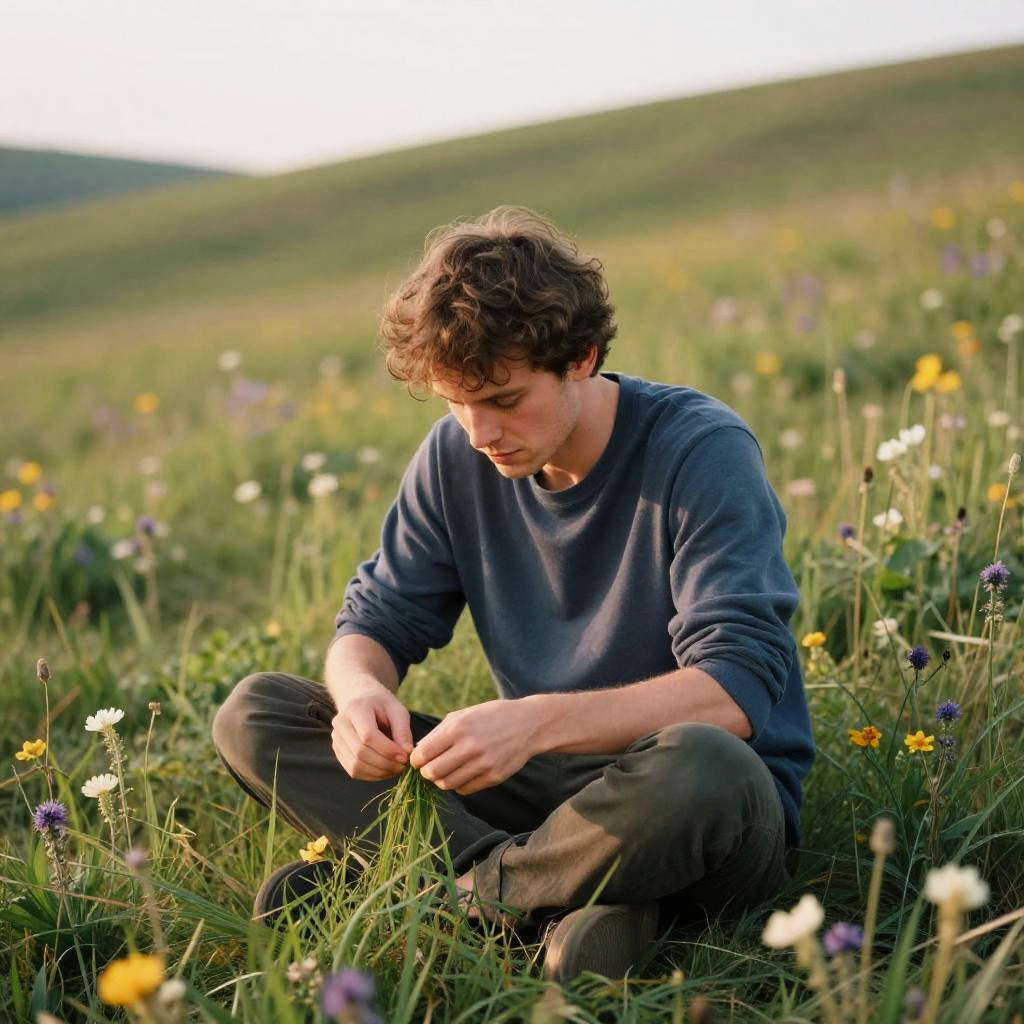 Man eating grass on a peaceful hillside, natural setting with wild flowers, realistic textures, warm natural lighting, contemplative mood, high resolution portrait