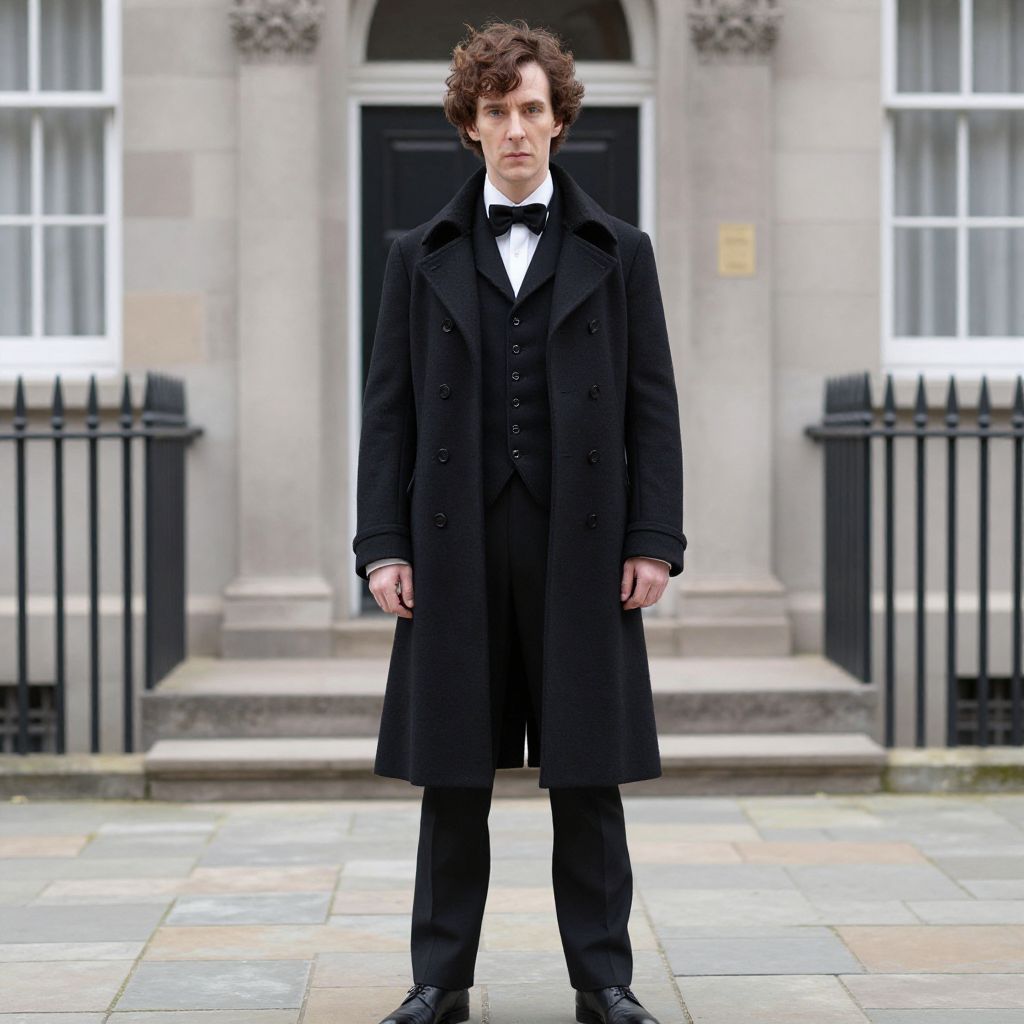 Photograph of a young man with curly brown hair, standing in front of a stone building with black iron railings. He wears a long, black, double-breasted overcoat over a black suit with a white dress shirt and black bow tie. His expression is serious, and he stands with his hands by his sides. The pavement is gray and slightly wet, with a yellow sign visible on the building behind him. The overall style is formal and somewhat Victorian. The lighting is natural, suggesting an overcast day.