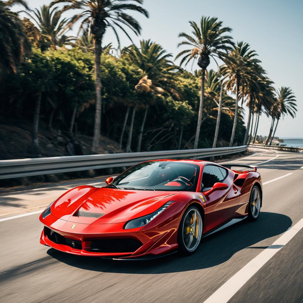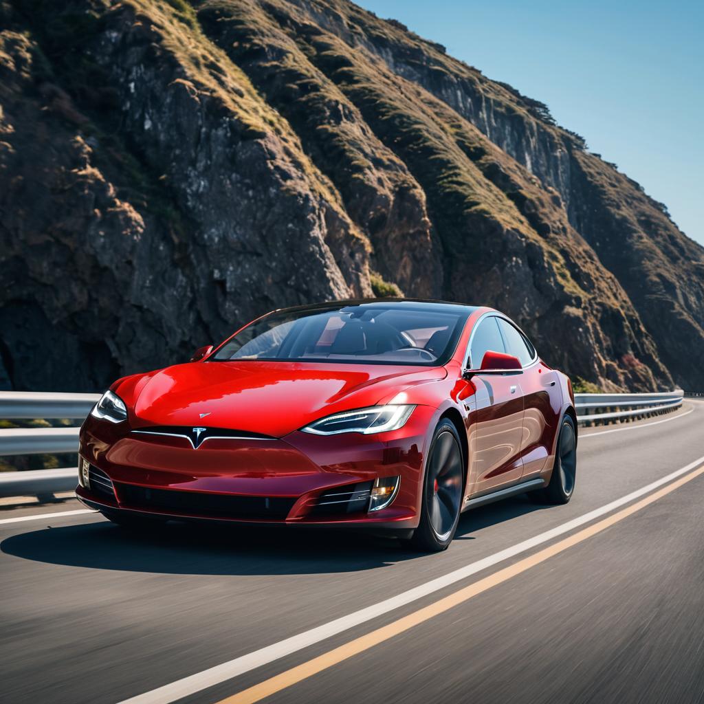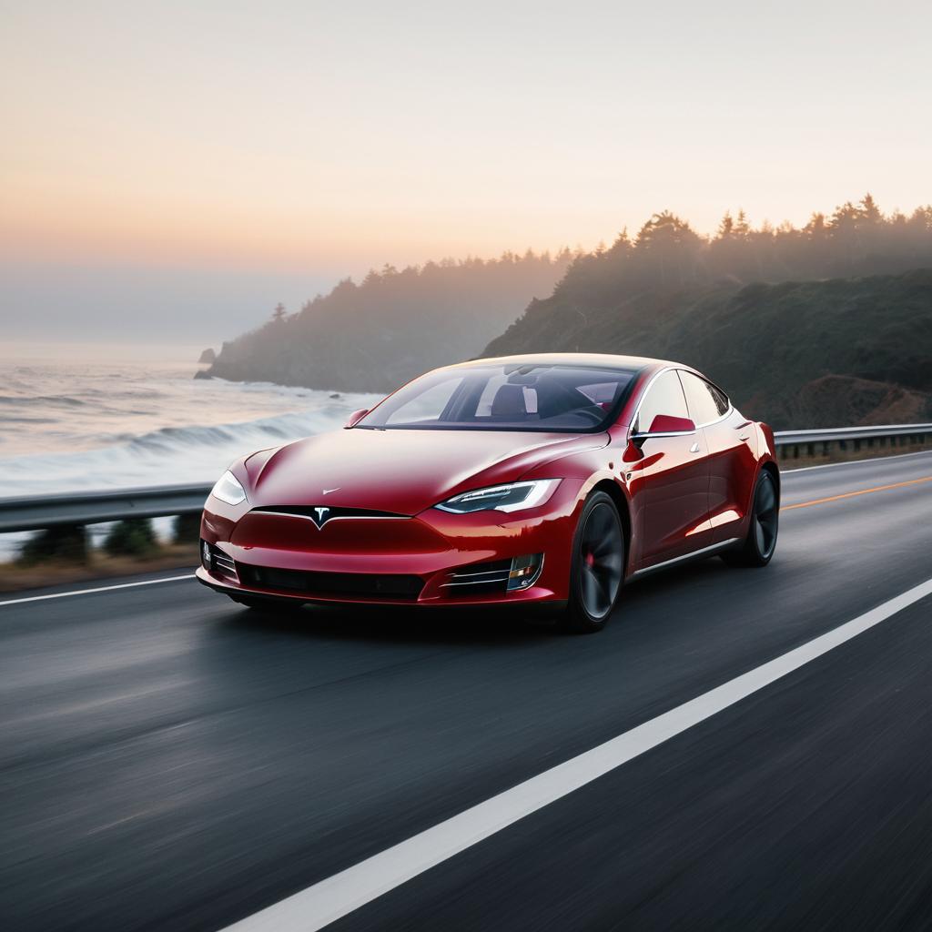 Metallic Red Tesla Model S Plaid driving along a sunlit coastal highway with crashing waves, captured in motion with a telephoto lens blurring the background, evoking a thrilling coastal escape filled with salty air and the sound of waves.