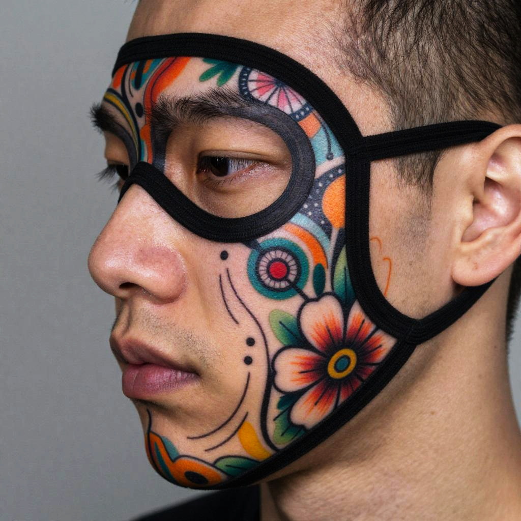 Close-up of a half mask tattoo wrapping around the jaw and cheek, bold lines with floral and abstract motifs, vibrant colors blending with natural skin tones, hyper-realistic tattoo art, studio lighting, edgy and modern aesthetic