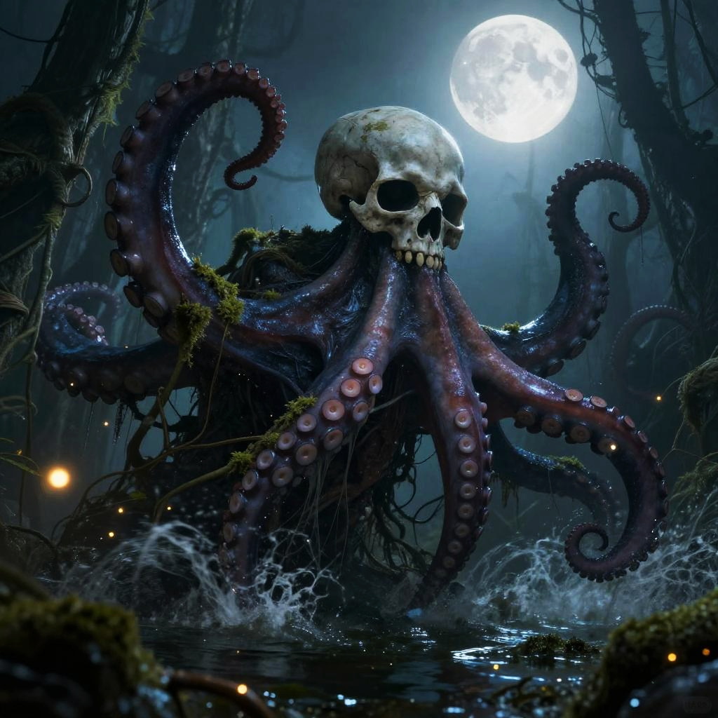 Zrpgstyle, from_side from_below dark swamp eldritch monster (skull face:1.2) creature with (octopus tentacles:1.2) rising out of the water moss slime vines churning water fireflies midnight moonlight backlight (masterpiece:1.2) (best quality) (detailed) (intricate) (8k) (HDR) (wallpaper) (cinematic lighting) (sharp focus) (intense action scene, dutch angle, foreshortening, motion blur, from below, blurred foreground:1.3)
