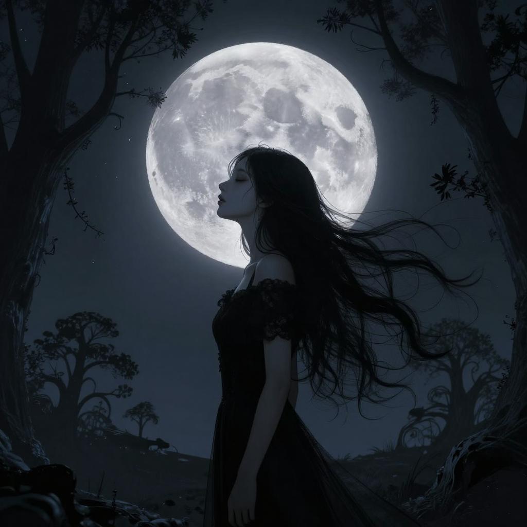 An elegant woman wearing a flowing, hooded black gown with a deep neckline and a high slit stands in a dark, foggy forest. The scene is illuminated by a large full moon, with barren trees surrounding her and wet reflective ground beneath, creating a mysterious and ethereal atmosphere.