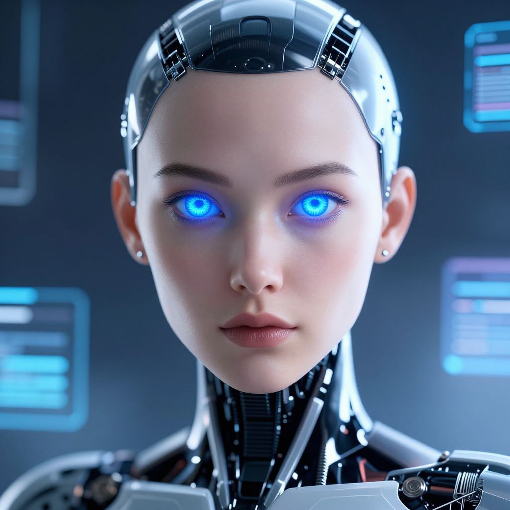 AI image generator producing an ultra-detailed portrait of an android with human features, luminous blue eyes, sleek metallic skin, futuristic background with holographic elements, high contrast lighting showcasing advanced AI craftsmanship.