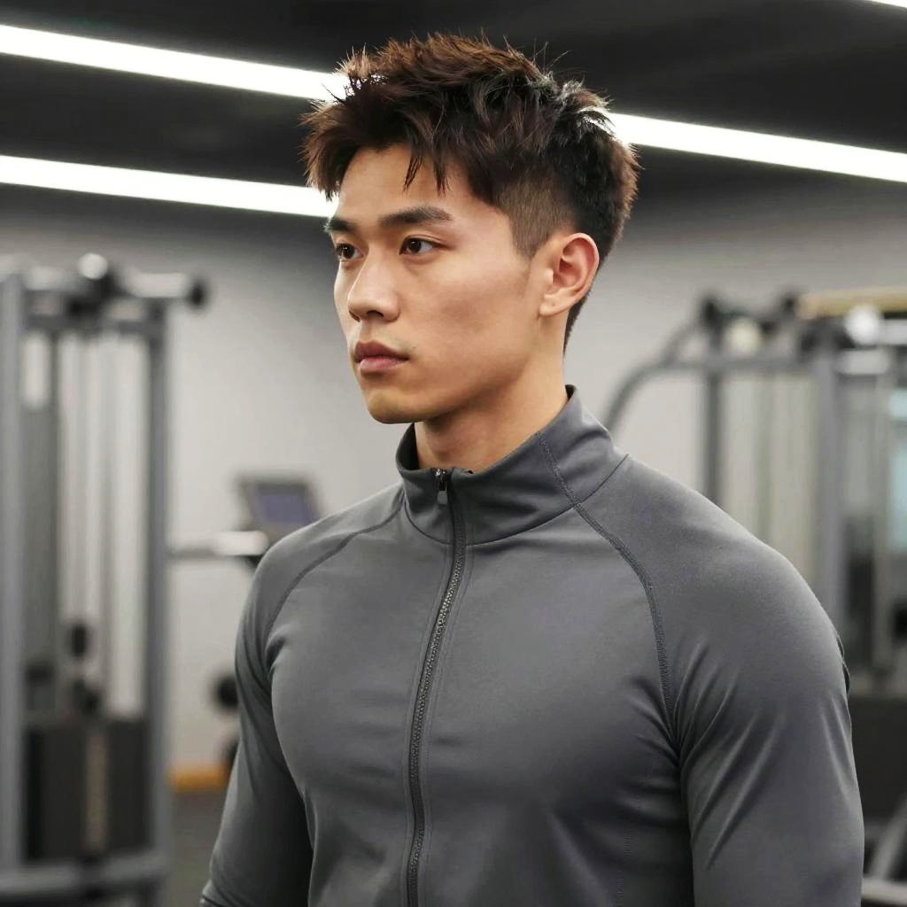 Textured Crop hairstyle on athletic male model, wearing fitted sports jacket, in modern gym interior, captured in fashion editorial style with bright artificial overhead lighting.