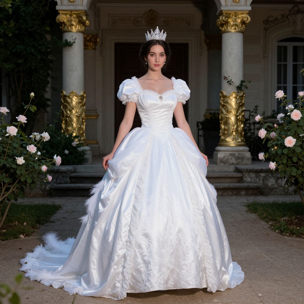 A realistic portrait of a beautiful woman in her late 20s with porcelain skin, high cheekbones, and warm brown eyes wearing a fully detailed classic Cinderella costume, including a long flowing white gown with a ruffled hem, a feathered train, and a sparkling crown, standing confidently in a moonlit courtyard of a 19th-century mansion with rose bushes and gilded columns in the background.. The woman has big tits and cute face