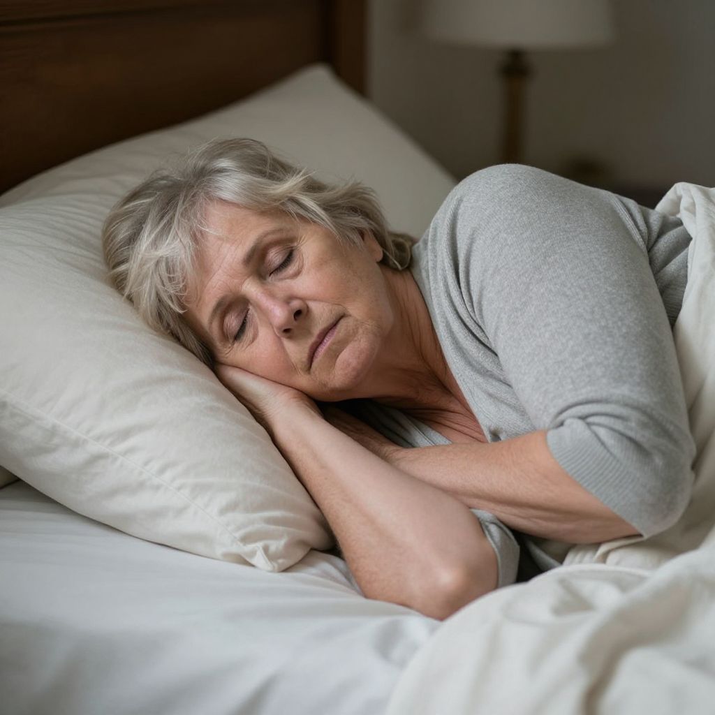Photograph of an elderly woman with short, gray hair, lying on a bed with white pillows and sheets. She is wearing a light gray long-sleeved shirt and has her eyes closed, resting her head on her right hand. Her expression is serene and peaceful. The background features a wooden headboard and a beige lampshade. The lighting is soft and natural, emphasizing the calm atmosphere. The image captures a moment of rest and tranquility.