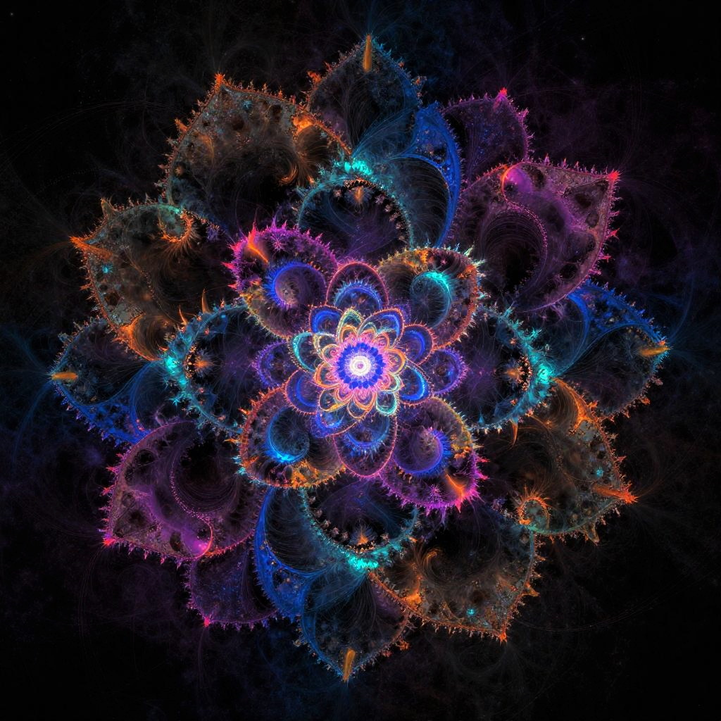 Free fractal generator creating vibrant, intricate fractal patterns bursting with colors, glowing edges, and infinite complexity, set against a dark cosmic background, emphasizing depth and symmetry in a digital art style.