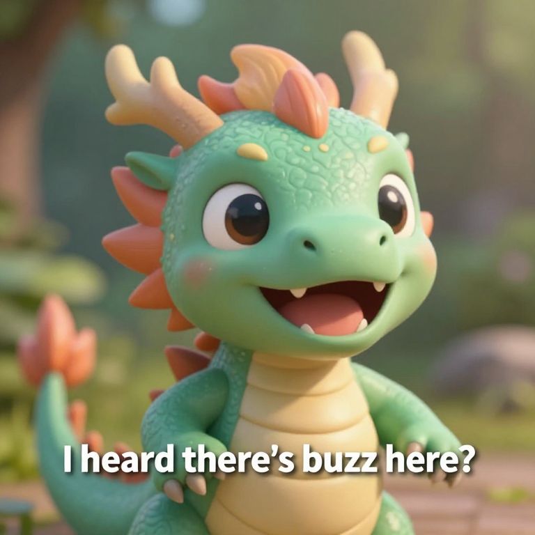 Photograph of a CGI cartoon dragon with a friendly expression, featuring large, expressive eyes, and a wide, open-mouthed smile revealing small teeth. The dragon has a green scaly body, orange-red spines along its back, and a cream-colored underbelly. It has two small horns on its head and a red-tipped tail. The background is a blurred, lush forest with green foliage and sunlight filtering through. The dragon has a playful, childlike appearance, and text at the bottom reads, "I heard there's buzz here?" in white, bold letters. The overall style is vibrant and whimsical.