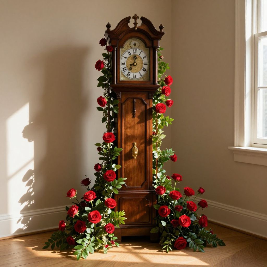 Grandfather clock stands elegantly adorned with cascading red roses and lush green foliage, creating a vibrant floral display that spills over its frame and onto the wooden floor, while sunlight streams through a nearby window, casting warm shadows across the scene.