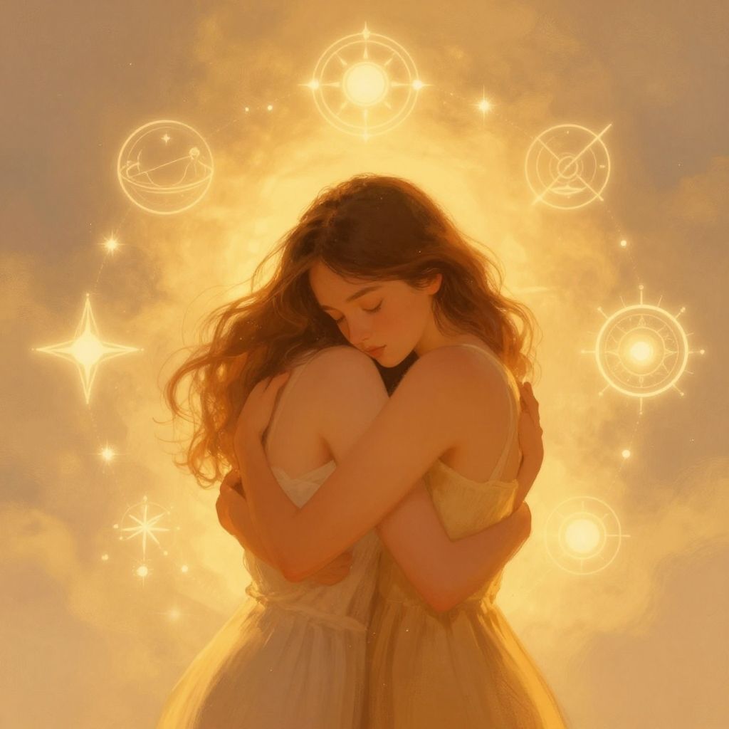 Symbol for self love, a person hugging themselves surrounded by celestial symbols and warm golden hues, dreamy background, digital painting, comforting and empowering vibe