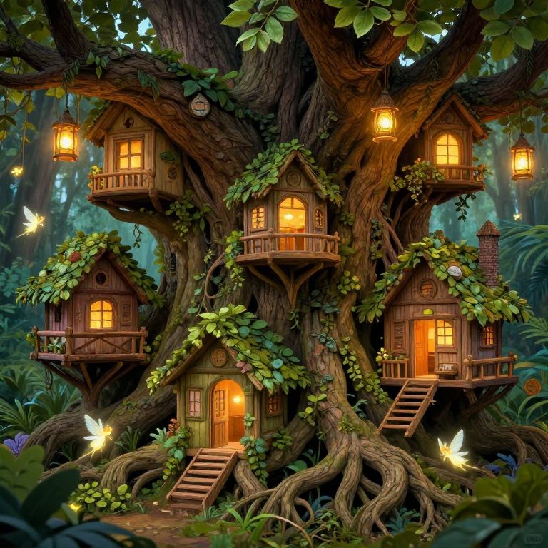 Whimsical digital illustration of a lush, enchanted forest treehouse with three glowing wooden cottages, lanterns, vines, and fluttering fireflies