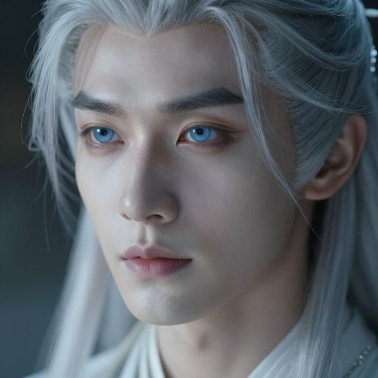 Close-up digital portrait of a young, fair-skinned male with striking blue eyes, long silver hair, and a serious expression, illuminated by soft blue