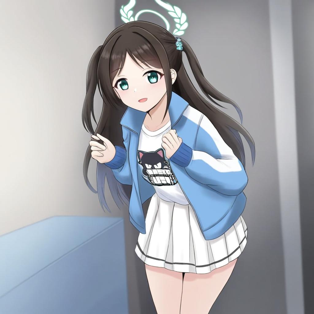 Airi (band) (blue archive), blue archive, 1girl, green eyes, long hair, black hair, brown hair, white shirt, white skirt, pleated skirt, blue jacket, open jacket, halo, green halo, long sleeves, by artist takaman (gaffe), anime