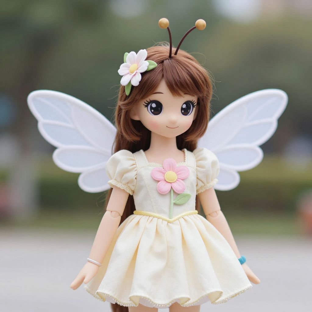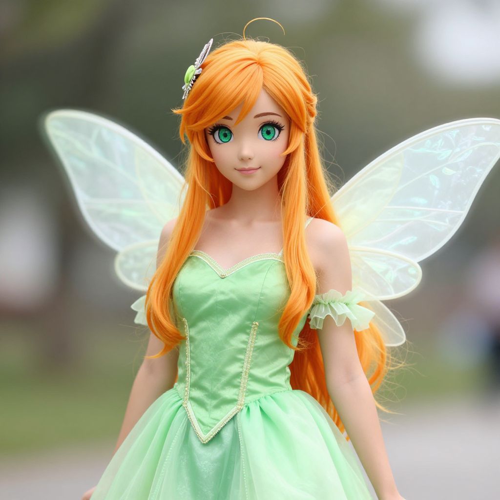Winx club costume green, 1girl, solo, wings, green eyes, fairy, long hair, green dress, dress, orange hair, looking at viewer, fairy wings, blurry background, bare shoulders, hair ornament, blurry