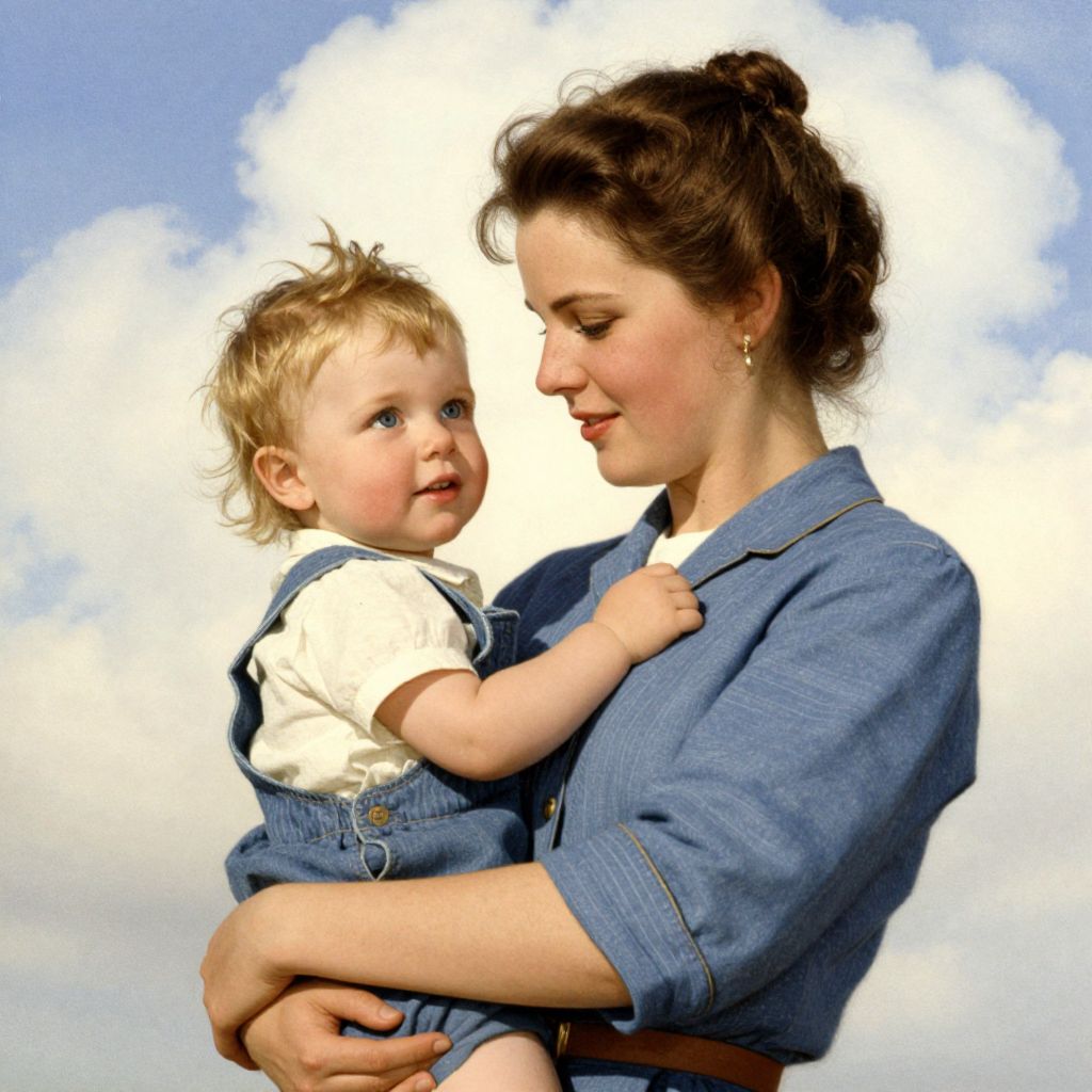 Photograph of a Caucasian woman with fair skin and dark brown hair in a bun, wearing a blue denim dress with white buttons, gently holding a blonde toddler with light skin and blue eyes. The toddler, dressed in a white shirt and blue denim overalls, looks up at the woman with a slight smile. The background is a bright, partly cloudy sky. The woman's expression is tender and focused on the child. The image is brightly lit with a soft, natural light.