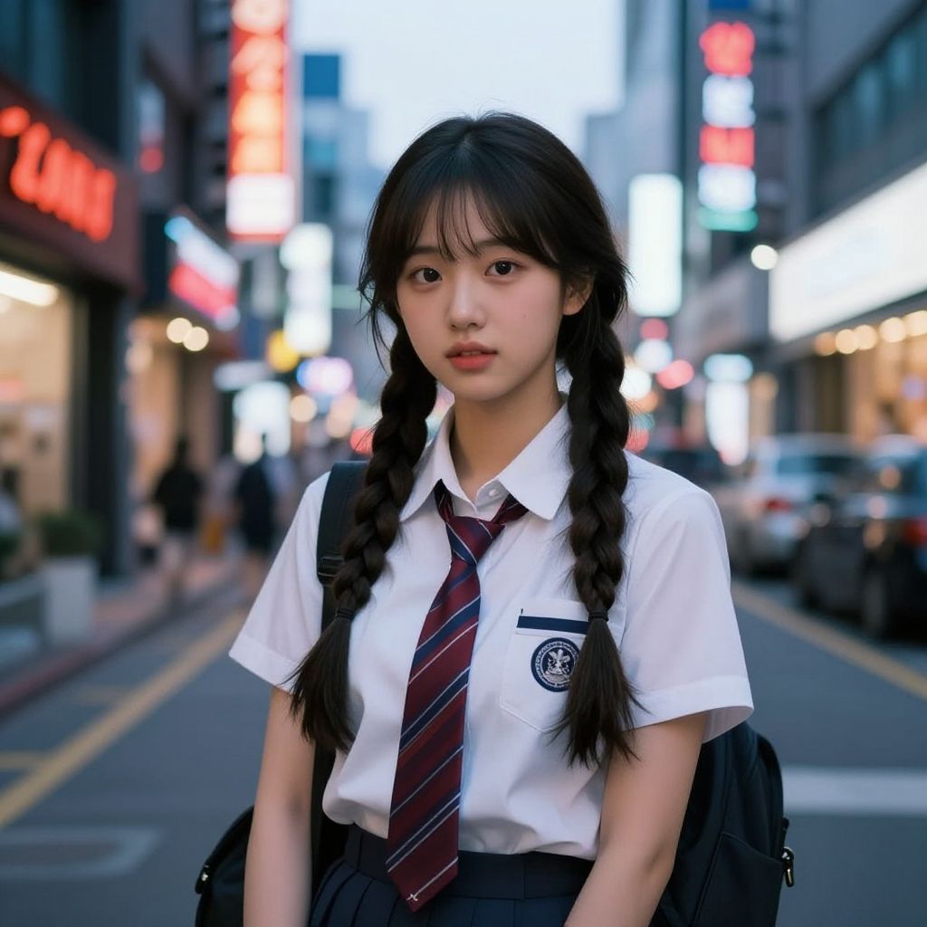 Korean schoolgirl with braided hair standing on city street at dusk, neon signs reflecting, urban vibe, stylish and contemporary, high detail, digital art