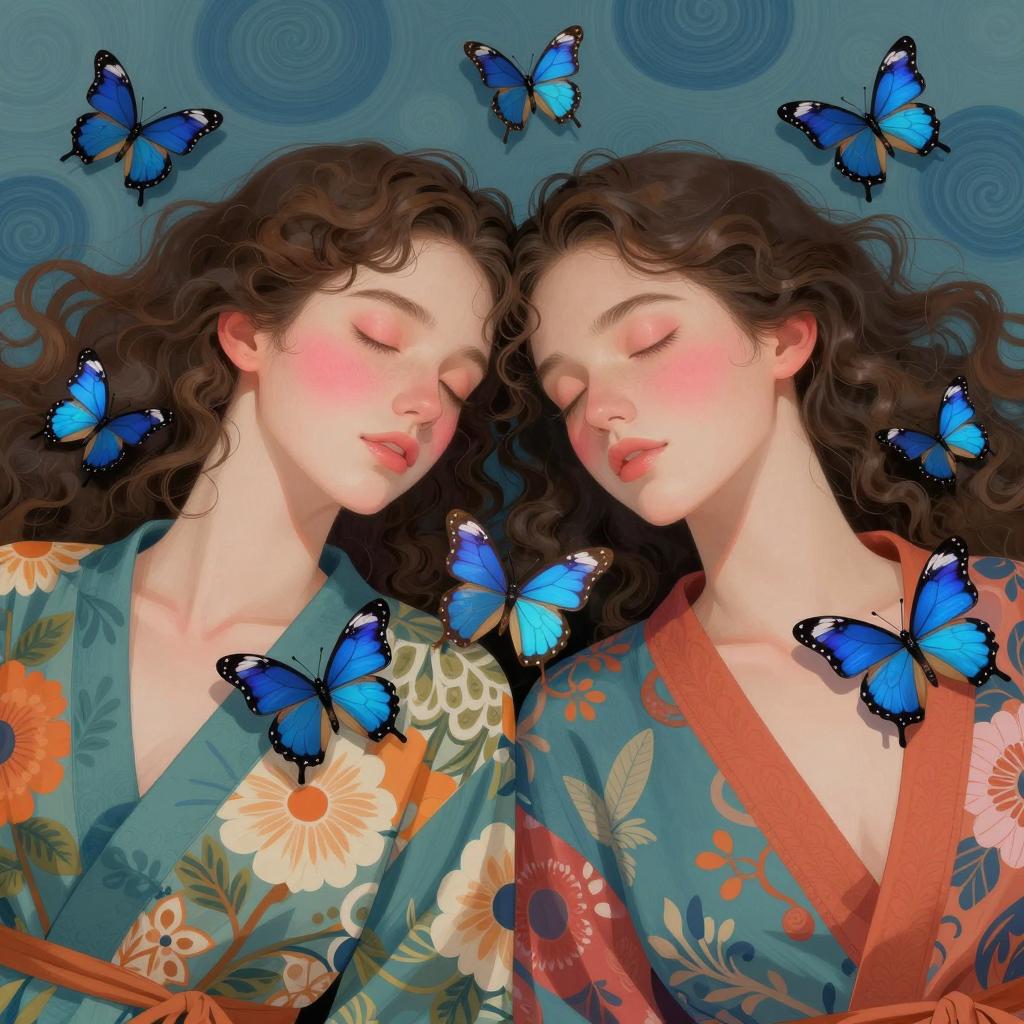 This captivating illustration features a young woman gracefully twirling in a colorful, ethereal landscape. The artwork blends enchanting shades and intricate details, highlighting butterflies fluttering in the background, which enhances the dreamlike atmosphere. The use of vibrant colors and expressive brush strokes brings a sense of movement and whimsy to the scene.