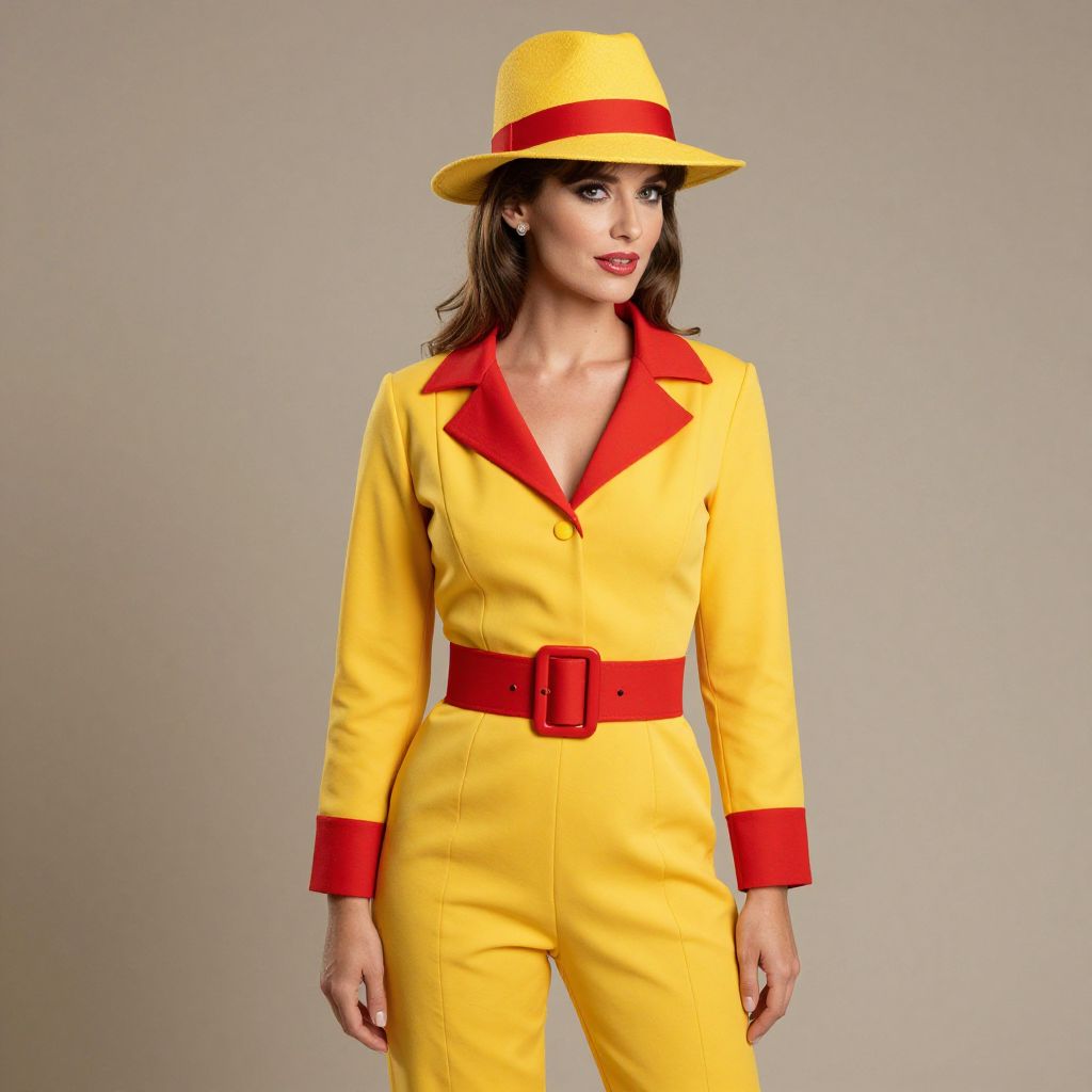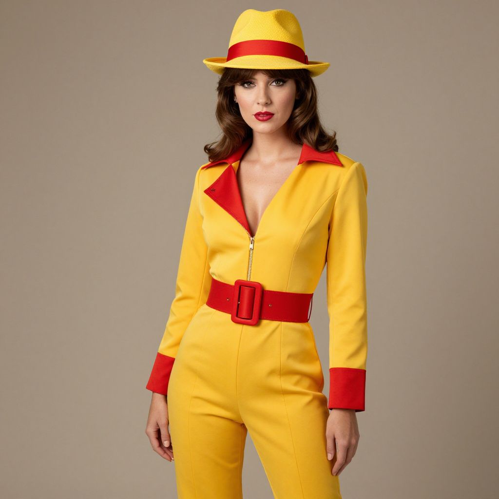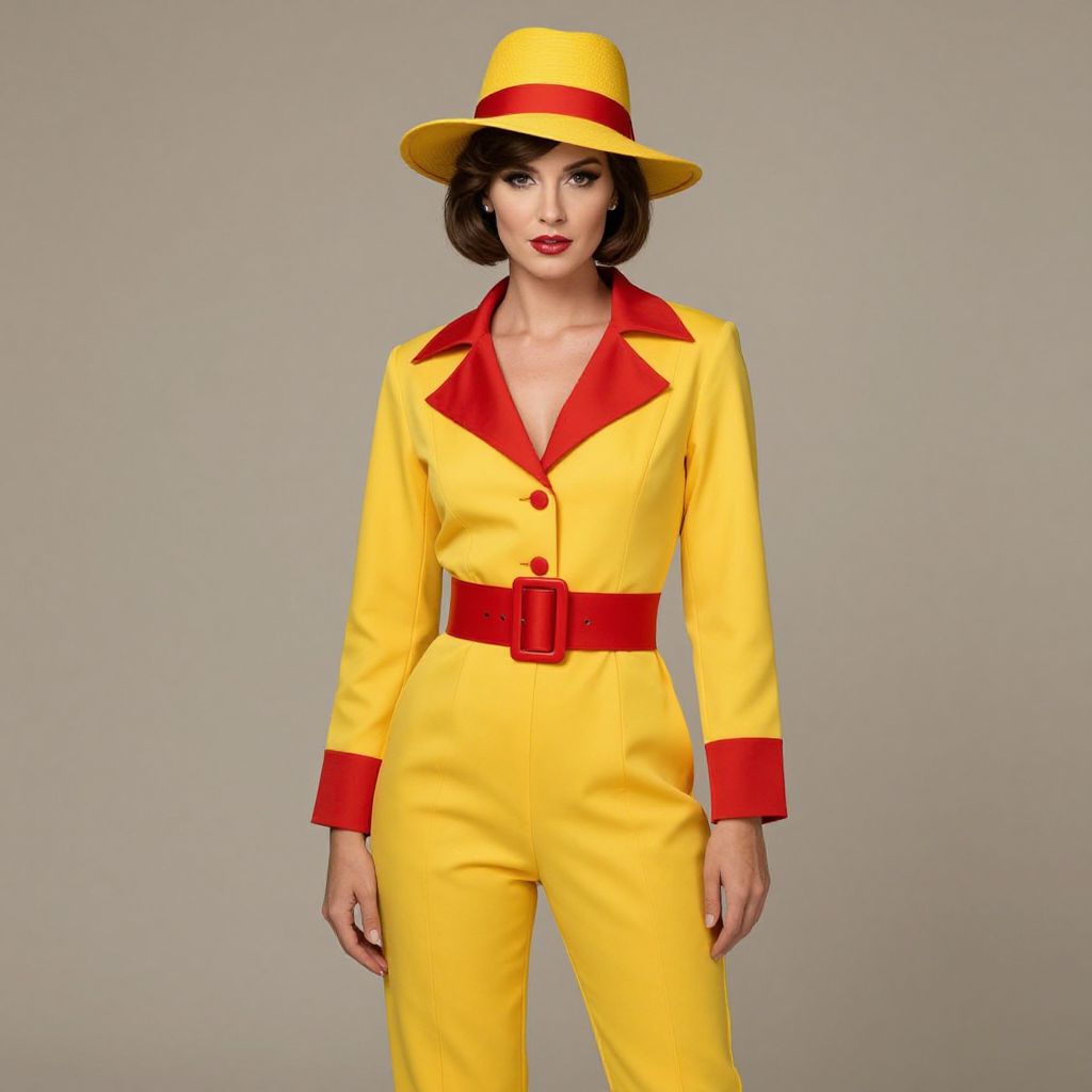 Photograph of a woman in a vibrant yellow jumpsuit with red accents, matching red belt, and yellow hat with red band, standing against a plain