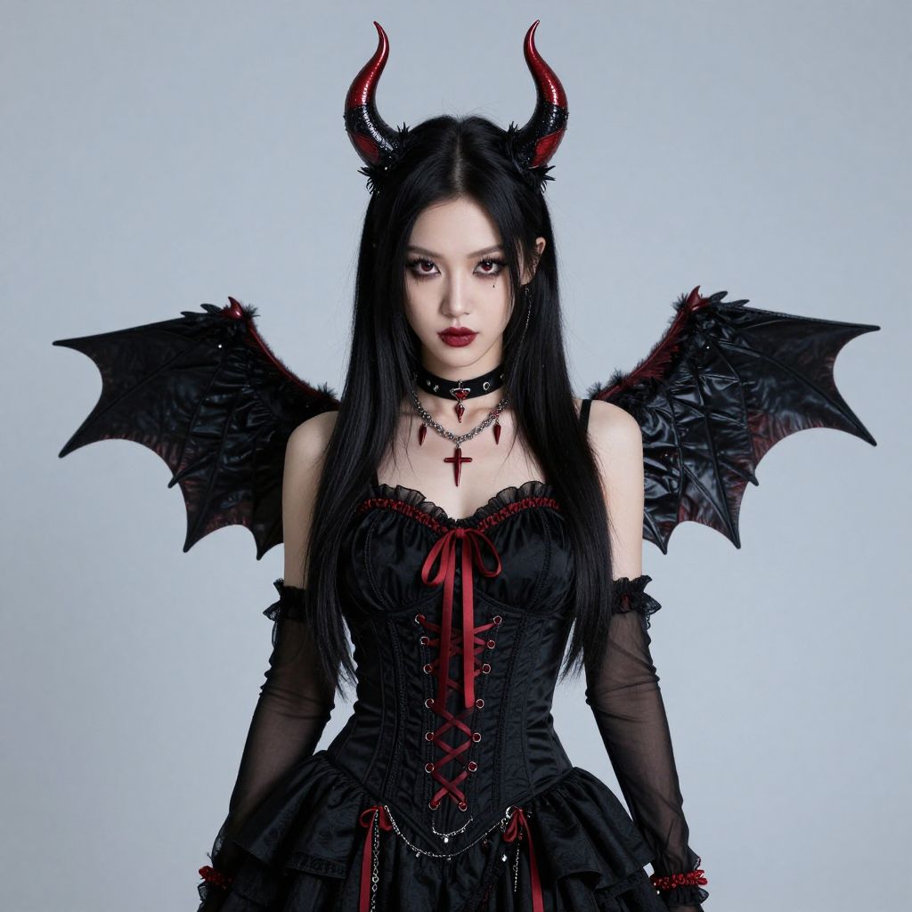 A woman in a black outfit with red accents and devil horns, exuding a dark, satanic aesthetic.