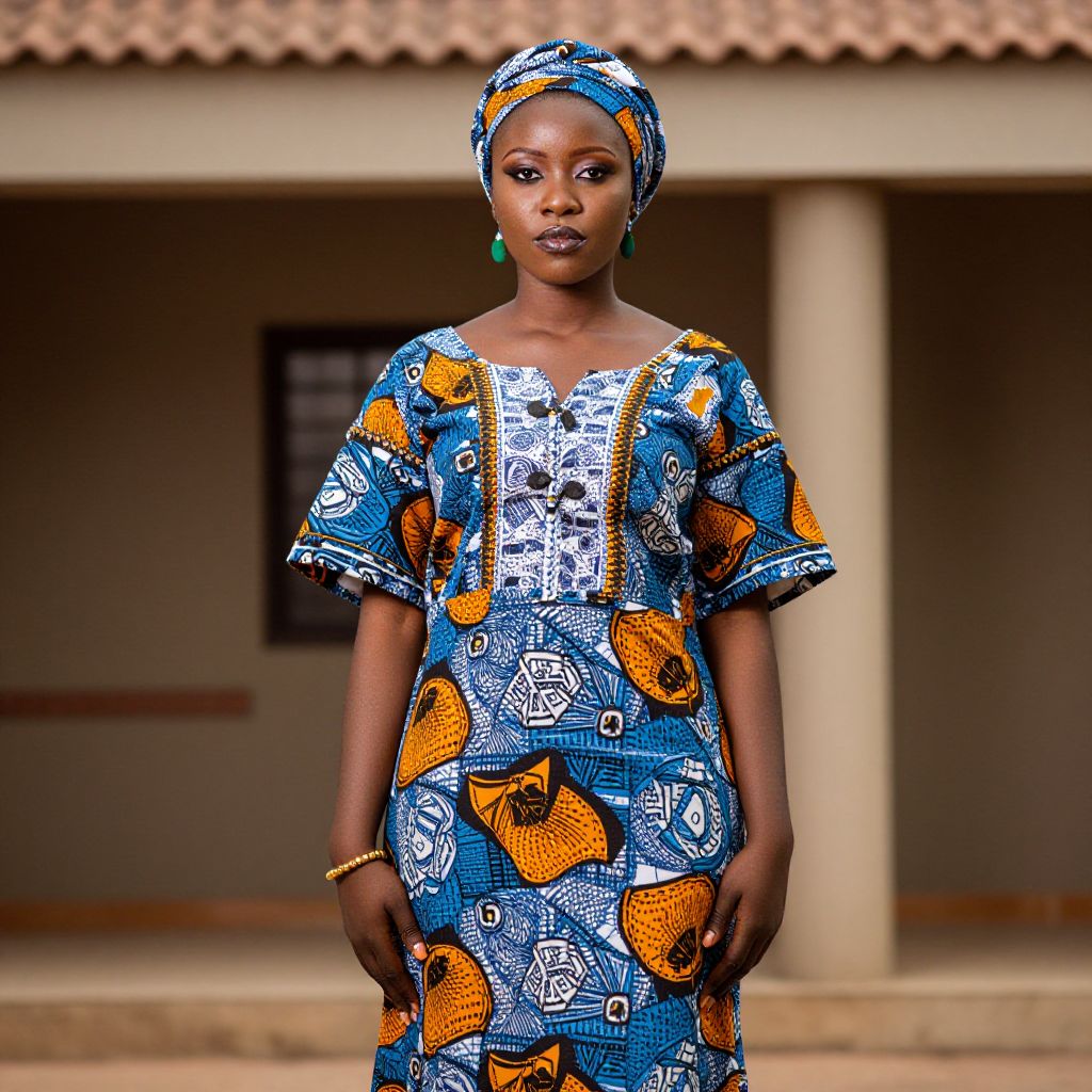 Photograph of a confident, dark-skinned African woman in a colorful blue and orange patterned dress and matching headscarf, standing in front of