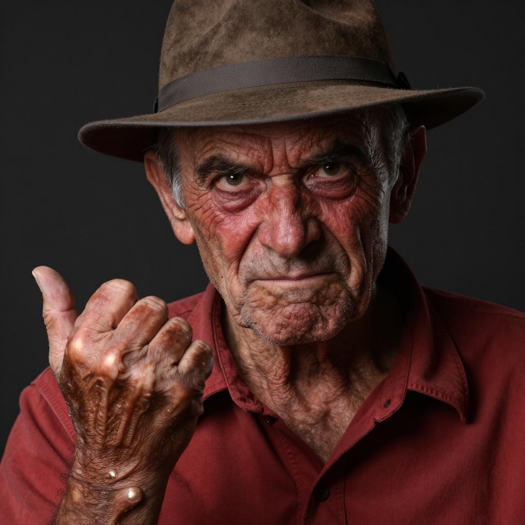 Close-up of an old man with wrinkled, red-tinged skin, wearing a brown hat. He has a menacing expression and is making a claw gesture with his right hand, which is covered in brown, metallic, claw-like fingers. He is wearing a red shirt. Dark, ured background.