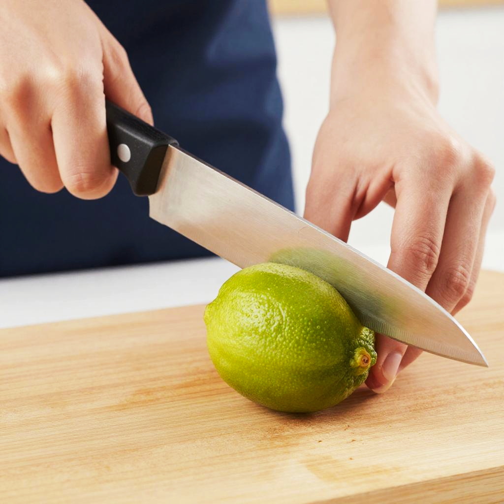 Photograph of hands cutting a green lime on a wooden cutting board with a silver knife, wearing a dark blue shirt.