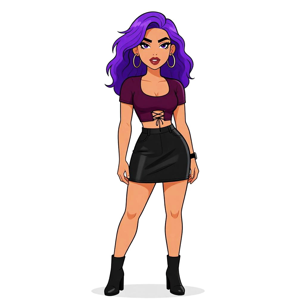 Woman with pretty face and pretty hair. Woman, edgy contemporary, fitted burgundy crop top with a scoop neckline and short sleeves, featuring a front cut-out detail with crisscross lacing, high-waisted black faux leather skater skirt, black ankle boots with chunky heels, minimalistic black wrist accessory, plain white studio background. --sref 1461
