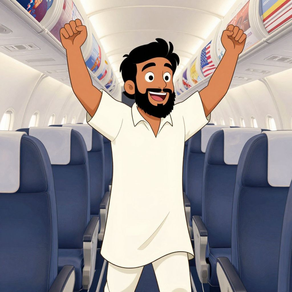 Cartoon of a bearded man with dark skin and black hair, wearing a white shirt and pants, excitedly raising arms inside a brightly lit airplane