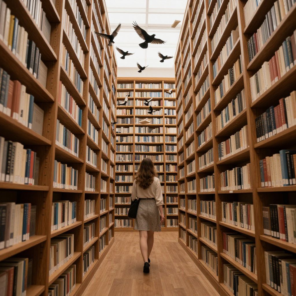 Photograph of a woman with long brown hair, wearing a white blouse and gray skirt, walking away from the camera down a narrow library aisle. Wooden bookshelves filled with colorful books line both sides of the aisle, leading to a bright skylight at the end. Five black birds fly above her head, creating a dynamic contrast against the white ceiling. The wooden floor adds warmth to the scene, and the overall atmosphere is serene and scholarly.
