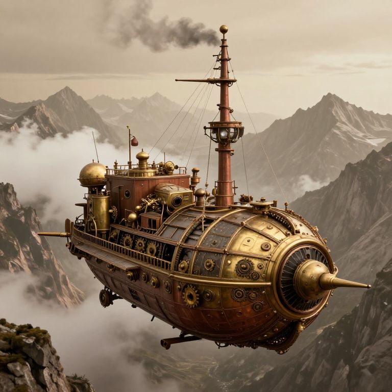 Jprdan portrayed in a steampunk airship flying over vast mountain ranges, intricate brass machinery and gears exposed, billowing steam clouds, warm sepia and copper tones, adventurous and fantastical mood, detailed craftsmanship