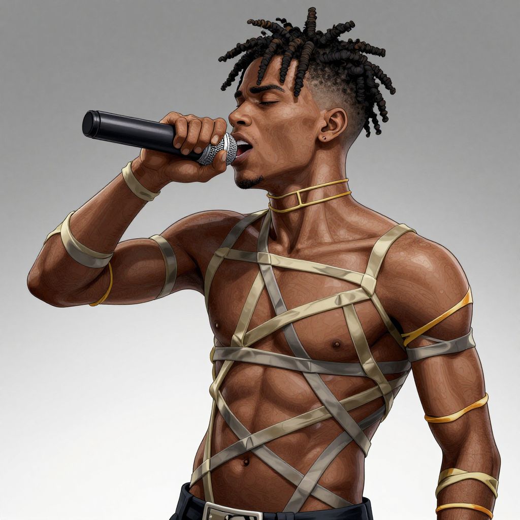 Digital illustration of a muscular, dark-skinned man with dreadlocks, wearing gold and beige strappy harness, singing into a microphone.