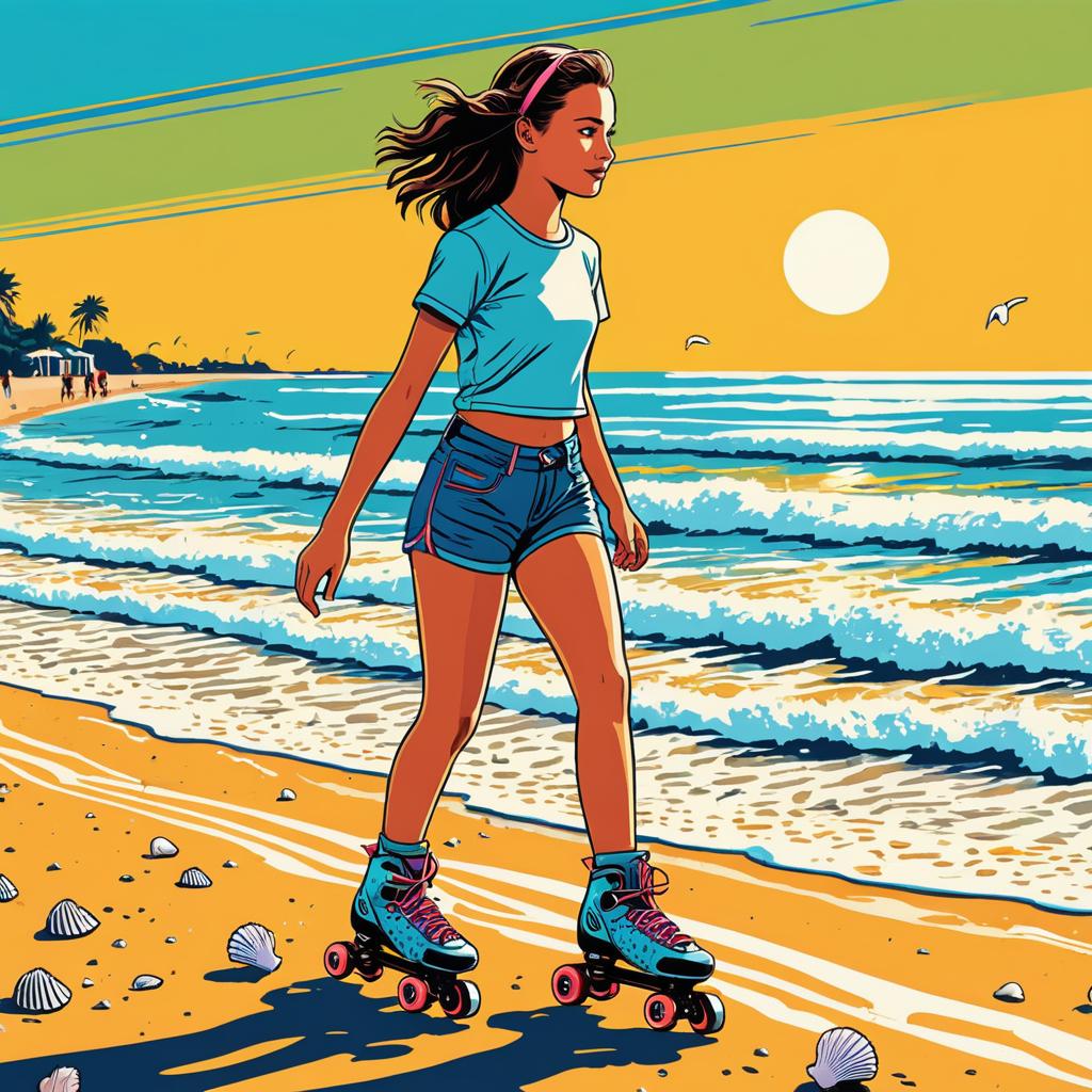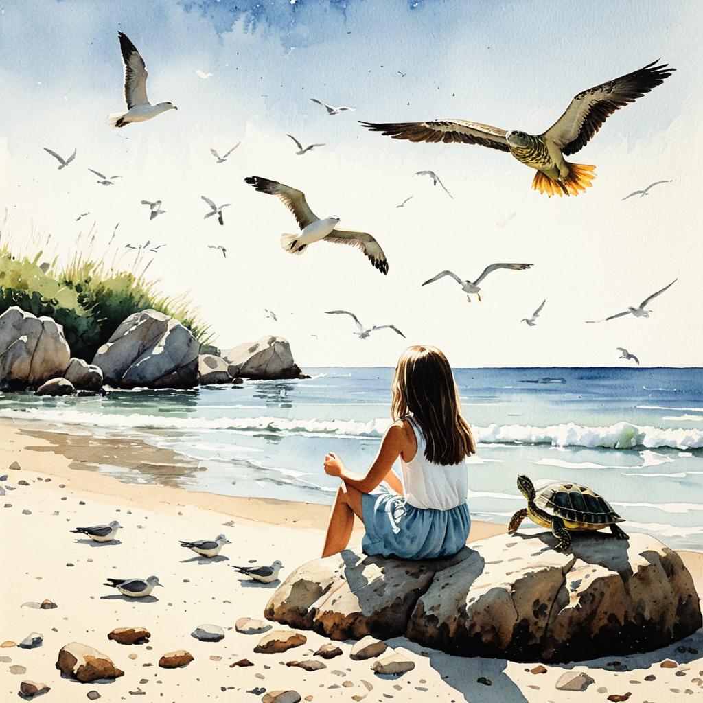 It’s a warm summer day, and a young girl and her turtle are at the beach. They watch seagulls soar while sitting on a warm rock, style: watercolor, mood: peaceful, lighting: soft afternoon, poster art, hand-drawn, off-white background
