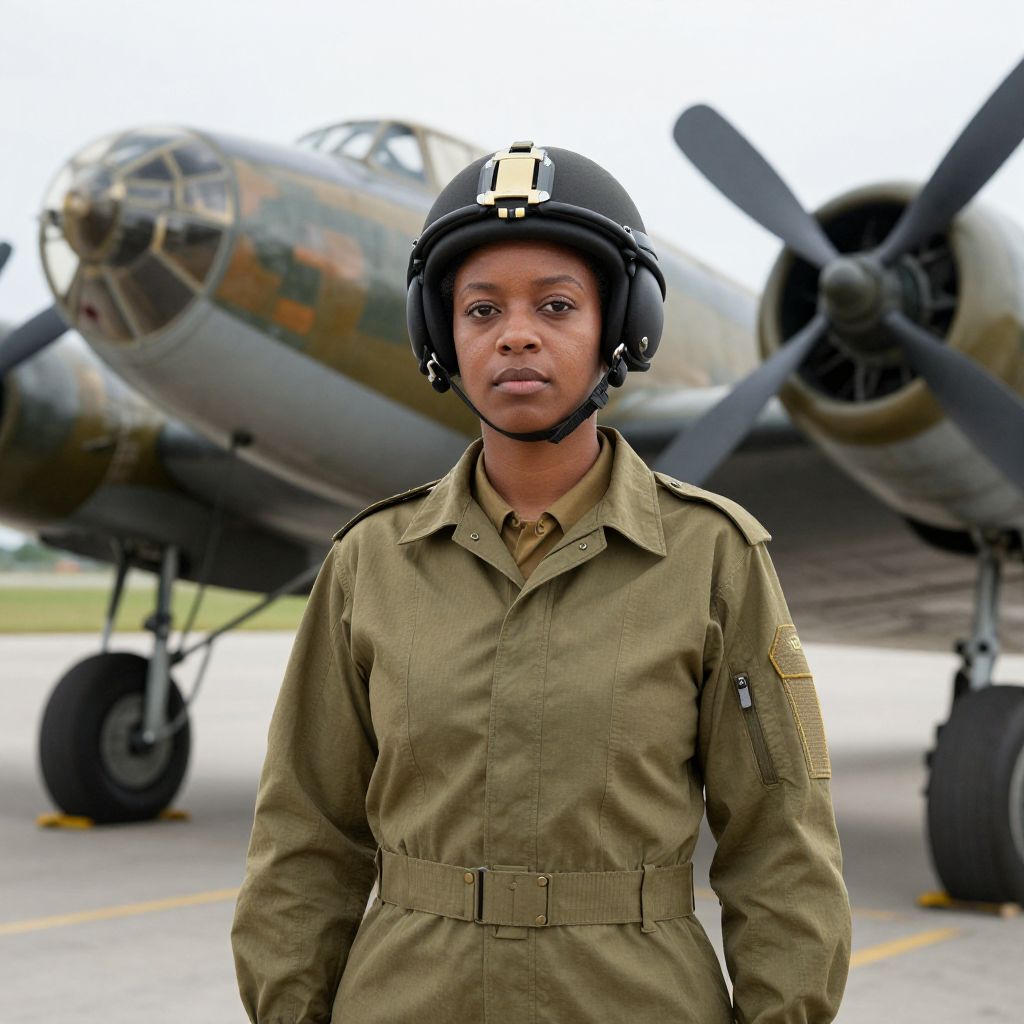 African American woman in a military uniform with a helmet, standing in front of a vintage World War 2 bomber plane.